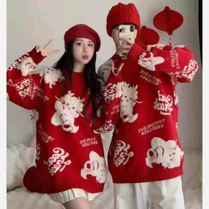 男女美式复古INS潮牌毛衣秋冬oversize慵懒风圆领情侣装针织衫,小整款带点...