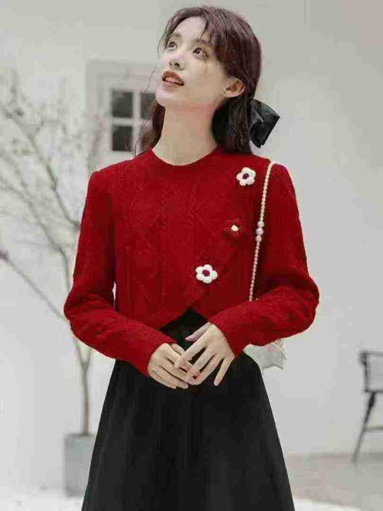 秋冬新款宽松慵懒风乐町草莓奶糖新年红氛围感包芯纱提花钻进套头毛衣,独立...