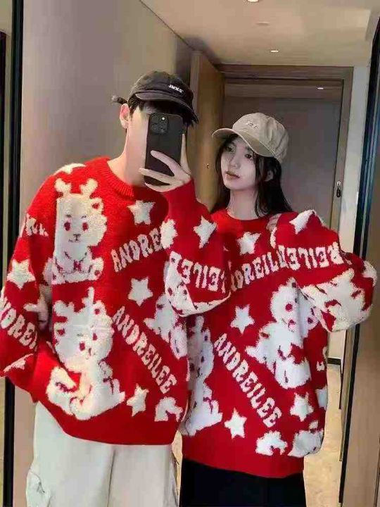 秋冬新款男女同款复古本命年红色提花包芯纱圆领套头毛衣,独立包装带吊牌,...