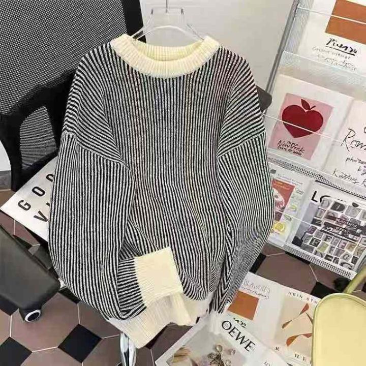 早秋新款复古日系宽松慵懒风v领撞色条纹马海毛套头毛衣,独立包装,均码大...