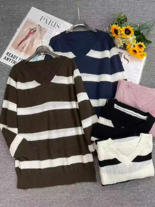 早秋新款复古日系宽松慵懒风v领撞色条纹马海毛套头毛衣,独立包装,均码大...