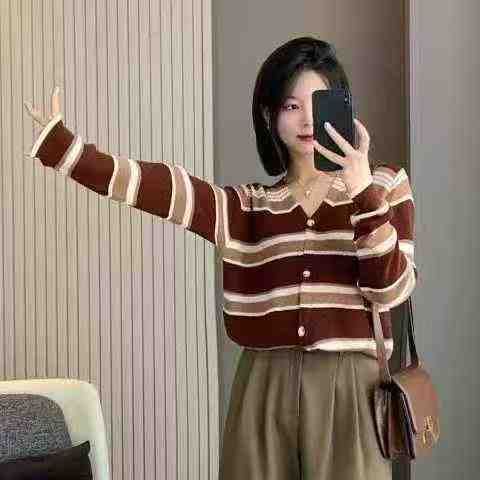 秋冬新款复古条纹撞色气质显瘦高级感针织毛衣开衫,独立包装,均码面料软糯...