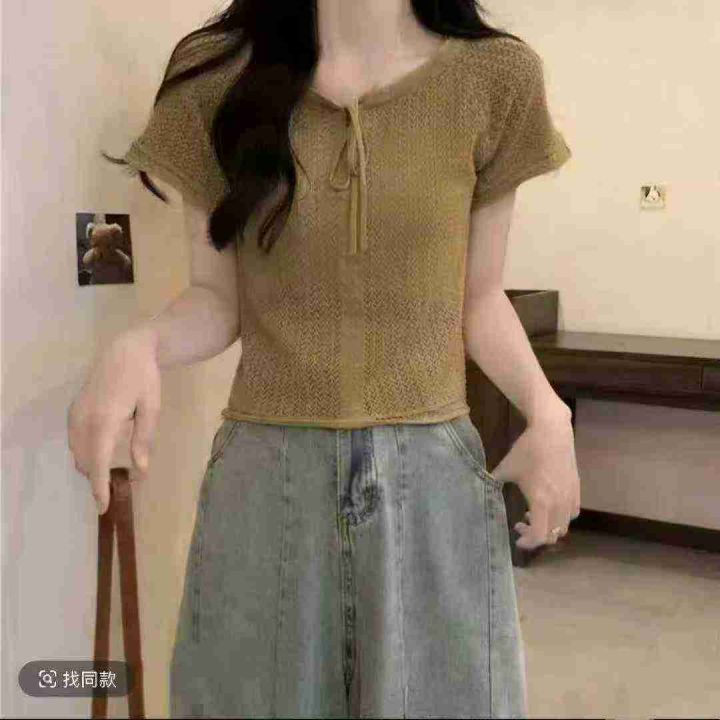 夏季洋气百搭薄款镂空针织设计感小众独特绑带针织小衫,独立包装,900件,...