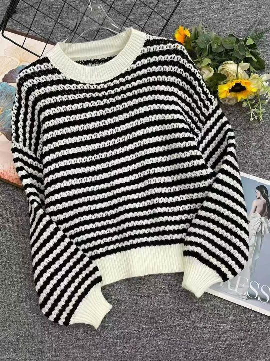 春秋新款高品质宽松显瘦慵懒风撞色条纹复古百搭圆领包芯纱套头毛衣,面料软...