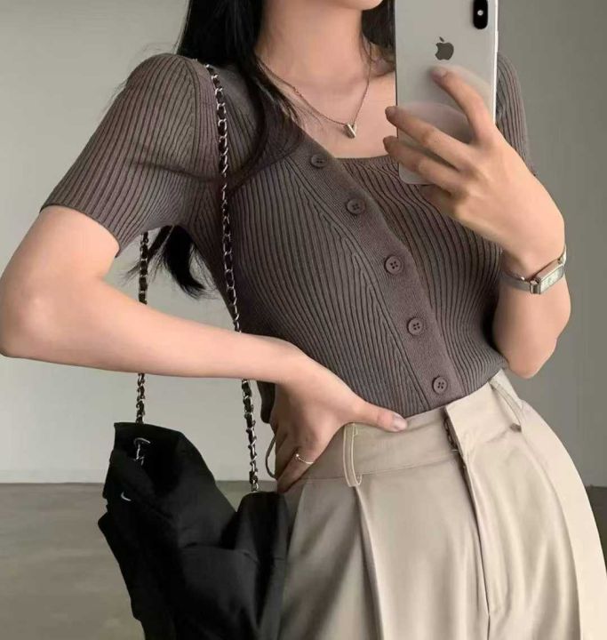 捡漏款,夏季新款法式复古设计感斜扣半露肩冰丝曲珠针织小衫,面料软糯舒适...