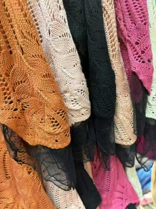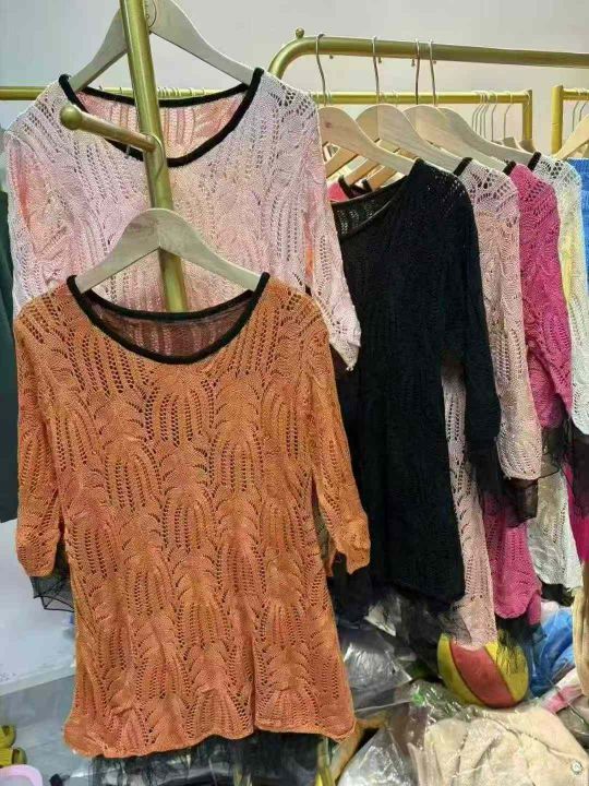 女士镂空中袖边蕾丝针织衫。数量200多件,独立包装,均码,大众人群可穿,...