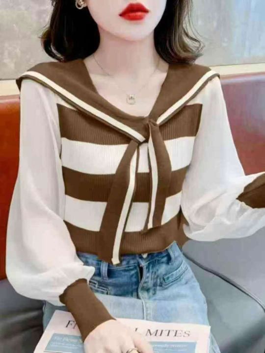 7.9元清海军领系带披肩款拼接雪纺袖针织衫,数量1800件左右,均码,单款多...