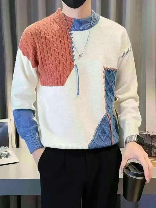 早秋新款复古美式小众破洞设计款宽松撞色百搭针织套头毛衣,独立包装,均码...