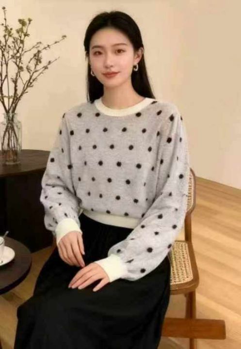 秋冬新款法式气质方领宽松爱心波点提花可爱泡泡袖套头毛衣,独立包装,均码...