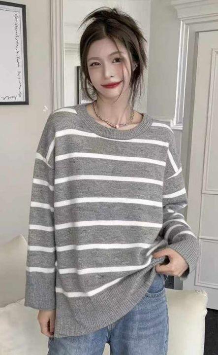 春季新款品牌原单撞色条纹宽松落肩圆领套头毛衣,独立包装带吊牌,面料软糯...
