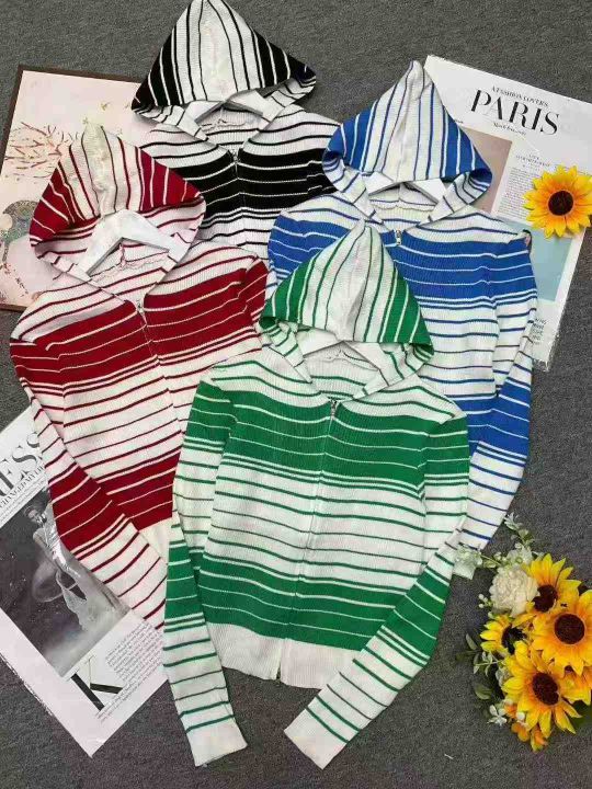 秋冬季新款弹力修身显瘦撞色条纹百搭双拉链连帽针织毛衣开衫,独立包装,均...