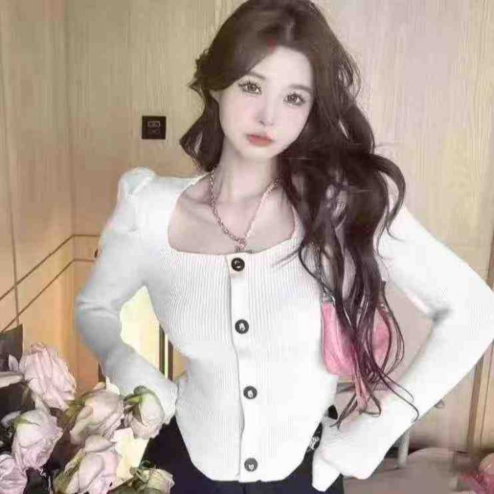 秋冬新款 弹力修身显瘦小香风气质方领排扣弧形泡泡袖针织套头毛衣,独立包...