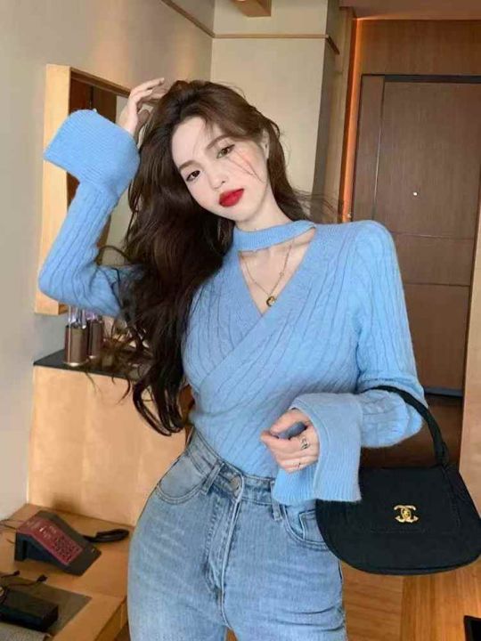 秋冬新款纯欲性感挂脖别致独特设计感小众转花针织套头毛衣,独立包装,均码...