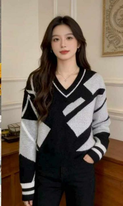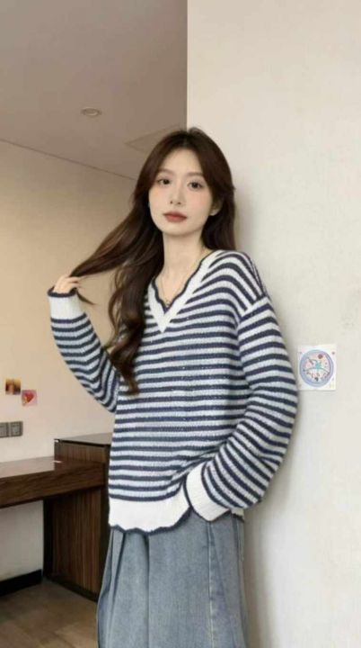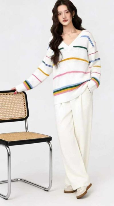 公司原单秋冬新款宽松慵懒等撞色条纹V领套头毛衣,独立包装,码数S- 2XL码...