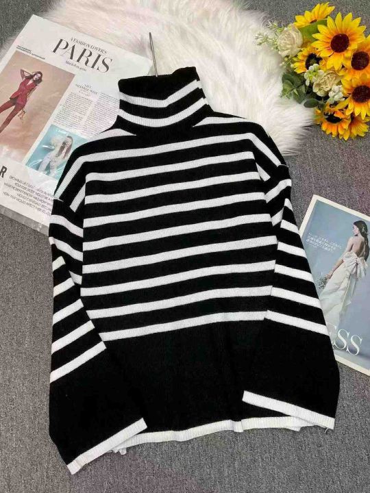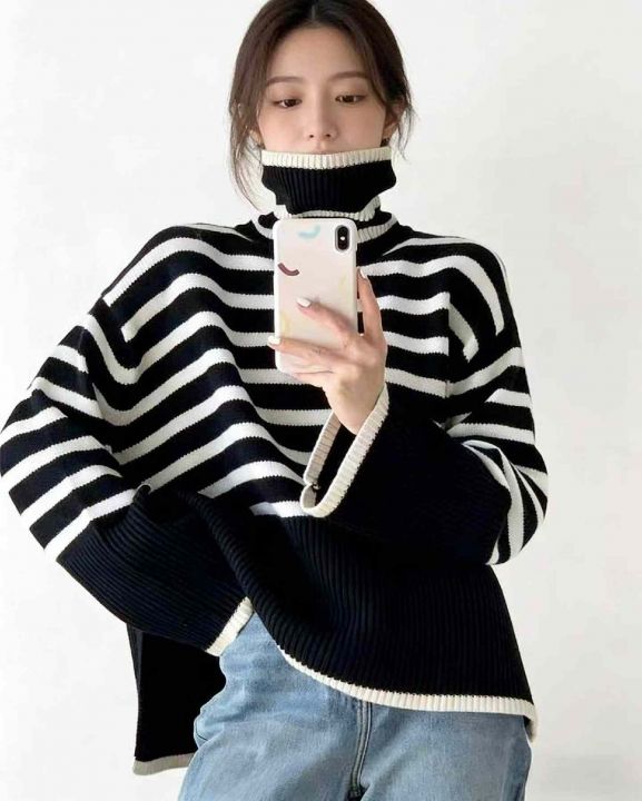 秋冬新款宽松慵懒风百搭撞色条纹针织套头毛衣,独立包装,均码面料软糯舒适...