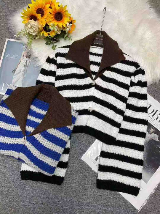秋季新品法式复古小香风翻领撞色条纹设计感收腰短款泡泡袖粗针毛衣开衫,独...