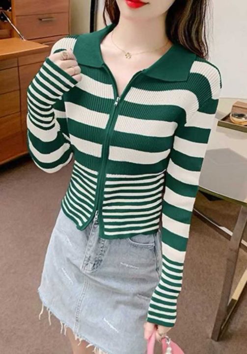 秋冬季新款弹力修身显瘦撞色条纹百搭双拉链针织毛衣开衫,独立包装,均码面...