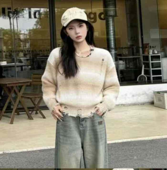 秋冬新款渐变撞色条纹短款宽松慵懒风针织套头毛衣,独立包装均码面料软糯舒...