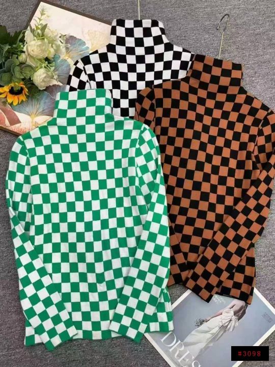 秋冬新款高品质欧洲站复古棋盘格拼色高领弹力修身显瘦包芯纱套头毛衣,独立...