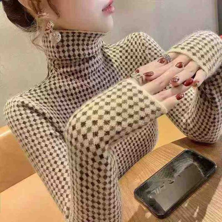 秋冬新款高品质欧洲站复古棋盘格拼色高领弹力修身显瘦包芯纱套头毛衣,独立...
