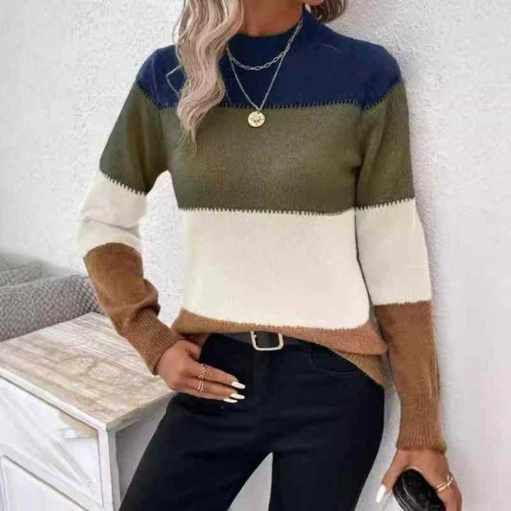 秋冬新款宽松百搭撞色条纹半高领加厚洋气套头毛衣,独立包装,码数S—XL码...