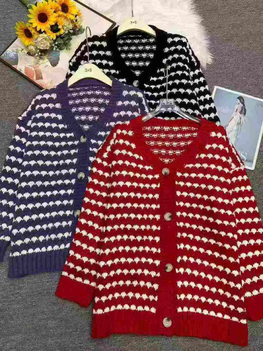 秋冬新款高品质的法式复古撞色条纹加厚宽松慵懒风毛衣开衫,独立包装,均码...
