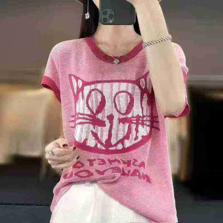 夏季新款时尚设计感拼色猫咪提花宽松慵懒风显瘦落肩针织小衫,独立包装,均...