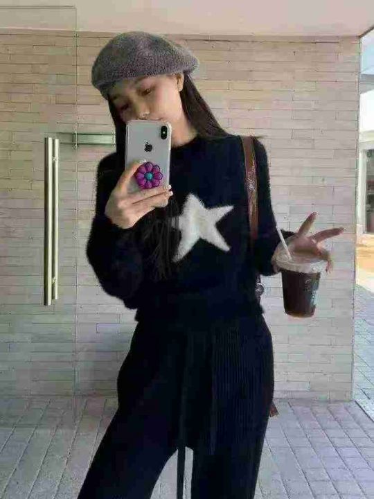 秋冬新款法式撞色五角星狗仔毛圆领套头毛衣,独立包装,均码面料软糯舒适,...