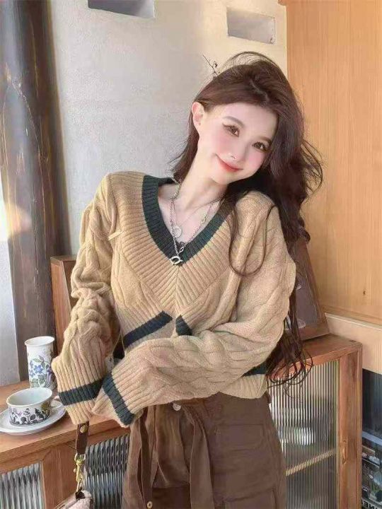 秋冬新款爆款慵懒风加厚麻花宽松短款设计感v领针织套头毛衣,独立包装,均...