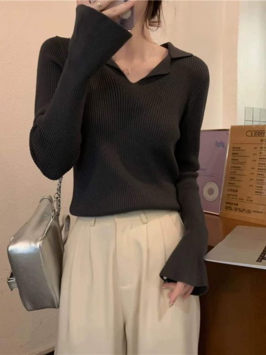 春秋新款法式复古净版简约宽松Polo领坑条包芯纱套头毛衣,独立包装,均码面...