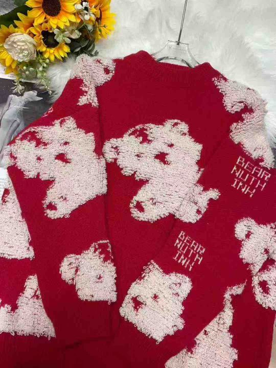 秋冬新款男女同款宽松百搭植绒卡通红色提花圆领套头毛衣,独立包装,均码面...