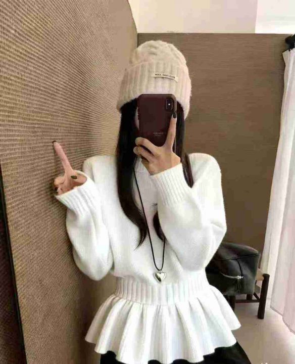 捡漏款,秋冬新款设计款甜美收腰显瘦荷叶摆包芯纱套头毛衣,独立包装,均码...