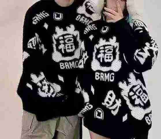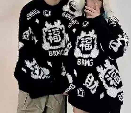 秋冬新款宽松韩系复古慵懒风小怪兽立体图设计款圆领羊毛马海毛套头毛衣,独...