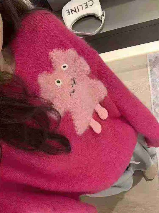 秋冬新款宽松韩系复古慵懒风小怪兽立体图设计款圆领羊毛马海毛套头毛衣,独...