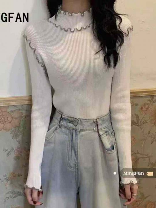 秋冬新款洋气设计感木耳边半高领弹力修身显瘦坑条套头毛衣,独立包装,均码...