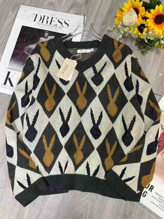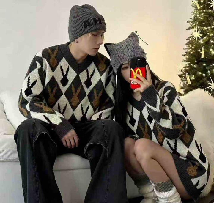 捡漏款,秋冬新款男女同款宽松百搭卡通北极绒V领套头毛衣,独立包装带吊牌...
