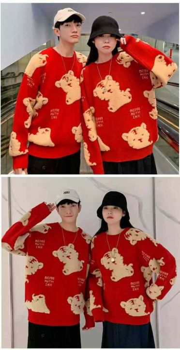 秋冬新款男女同款宽松百搭植绒卡通红色提花圆领套头毛衣,独立包装,均码面...