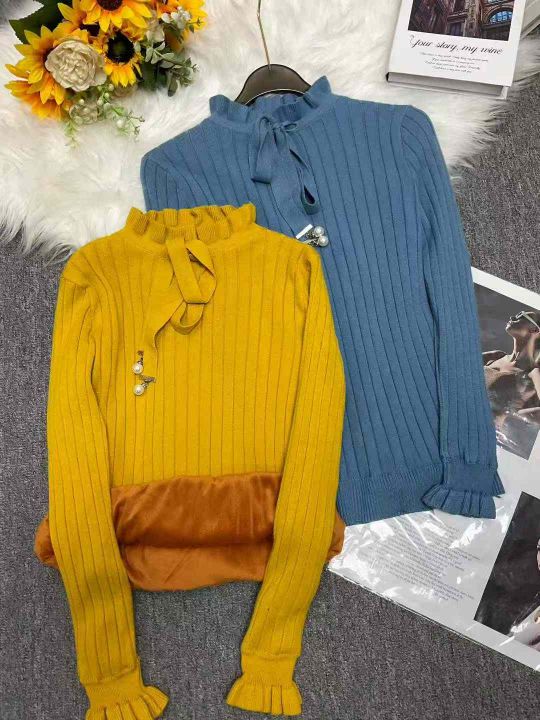 秋冬季新款蝴蝶结韩版弹力修身木耳边包芯纱套头毛衣,有加绒和不加绒,独立...