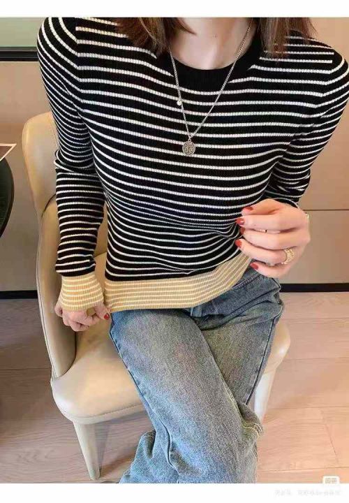 秋冬季新款设计感条纹方领甜辣弹力修身显瘦针织套头毛衣,独立包装,均码面...
