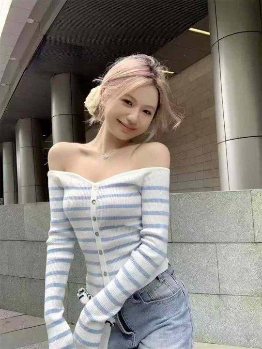 秋季新品法式条纹辣妹露肩一字肩高级感套头毛衣,独立包装,均码面料柔软舒...