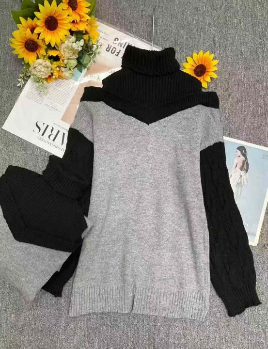 秋冬装新款慵懒风宽松撞色漏肩设计款小心机高领拼色套头毛衣,独立包装,面...