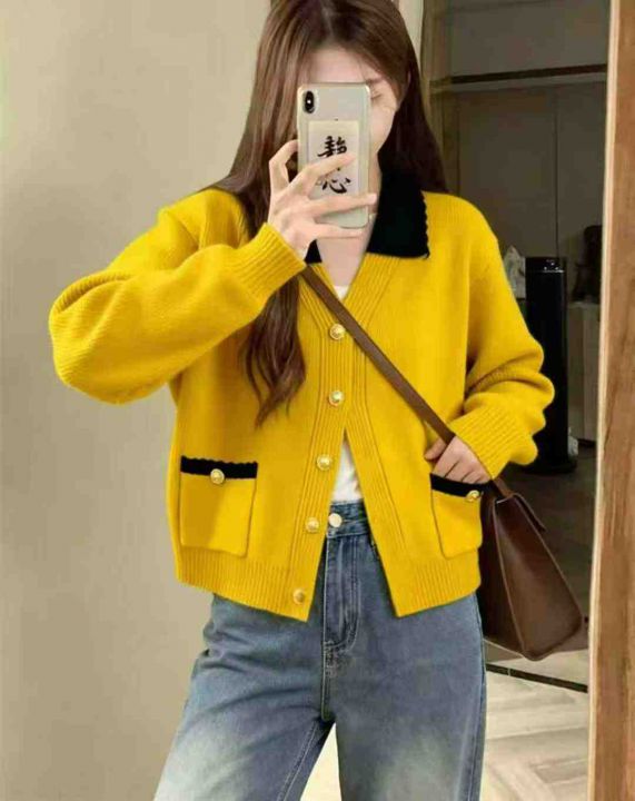 早秋新款小香风撞色翻领温柔风减龄百搭宽松显瘦毛衣开衫,独立包装,均码宽...