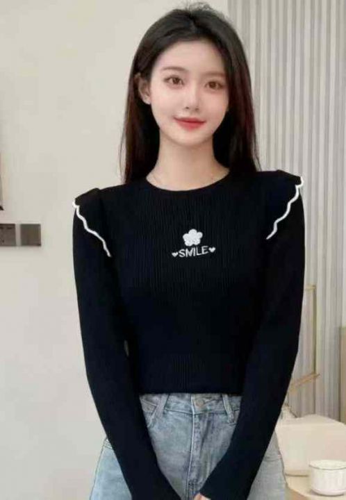 秋冬新款复古港味荷叶边弹力修身刺绣套头毛衣,独立包装均码面料柔软舒适弹...