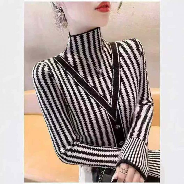 秋冬新款半高领时髦时尚洋气条纹提花包芯纱套头毛衣,独立包装,均码面料软...