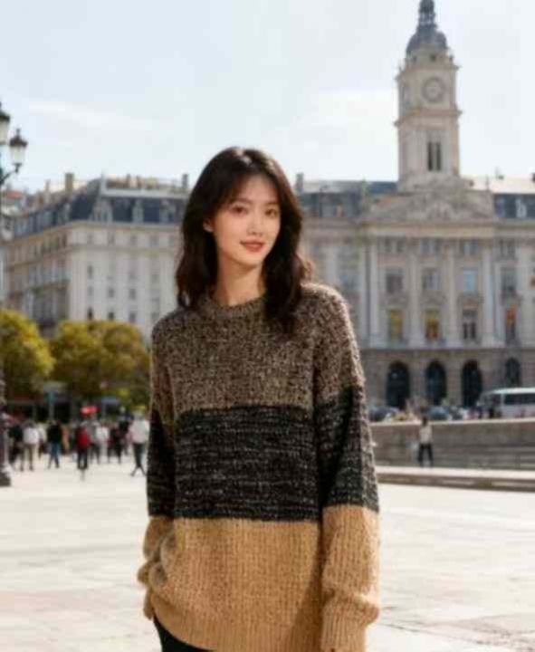 秋冬新款宽松慵懒风男女同款撞色条纹套头毛衣,独立包装,均码宽松版,82件...