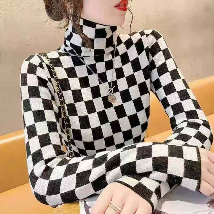 秋冬新款高品质欧洲站复古棋盘格拼色高领弹力修身显瘦包芯纱套头毛衣,独立...