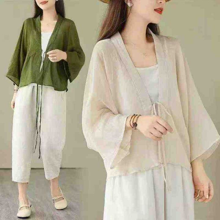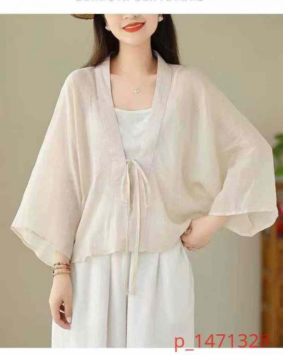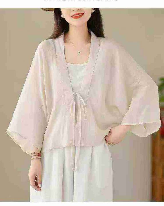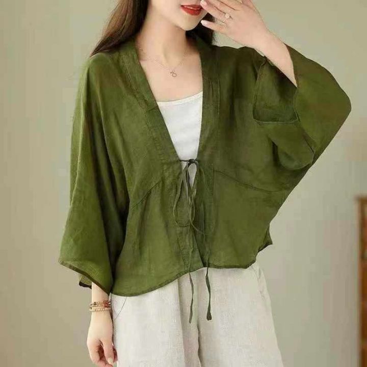 全清价5.9夏季文艺大码宽松蝙蝠袖苎麻开衫轻薄短外套纯色V领系带防晒衣女,...