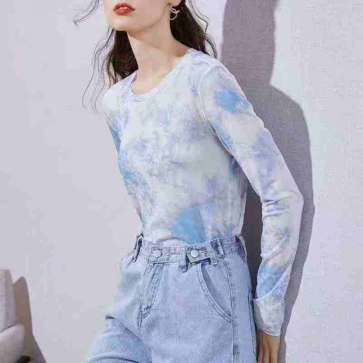 150件透视圆领印花网纱打底衫女薄款内搭纱衣性感防晒衣上衣,质量好高弹力...