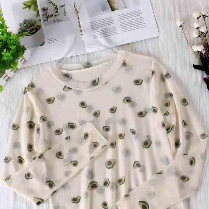 135件牛油果绿印花冰丝打底衫女内搭上衣性透视网纱防晒衣,尺码s-2XL,质量...