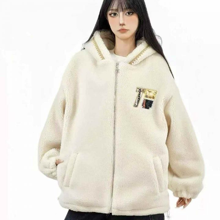 秋冬新款加绒(一体绒)可爱卡通软妹新款宽松百搭保暖羊羔毛连帽拉链外套,...